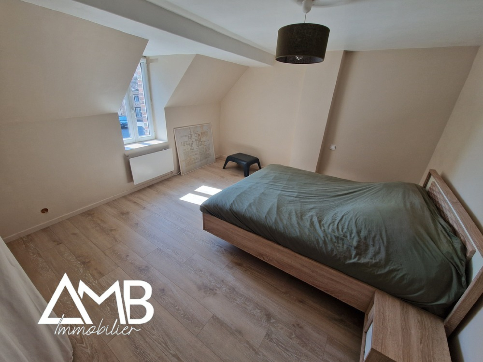 A l'étage : palier desservant deux chambres rénovées, ainsi qu'un accès au grenier aménageable d'environ 72 m².