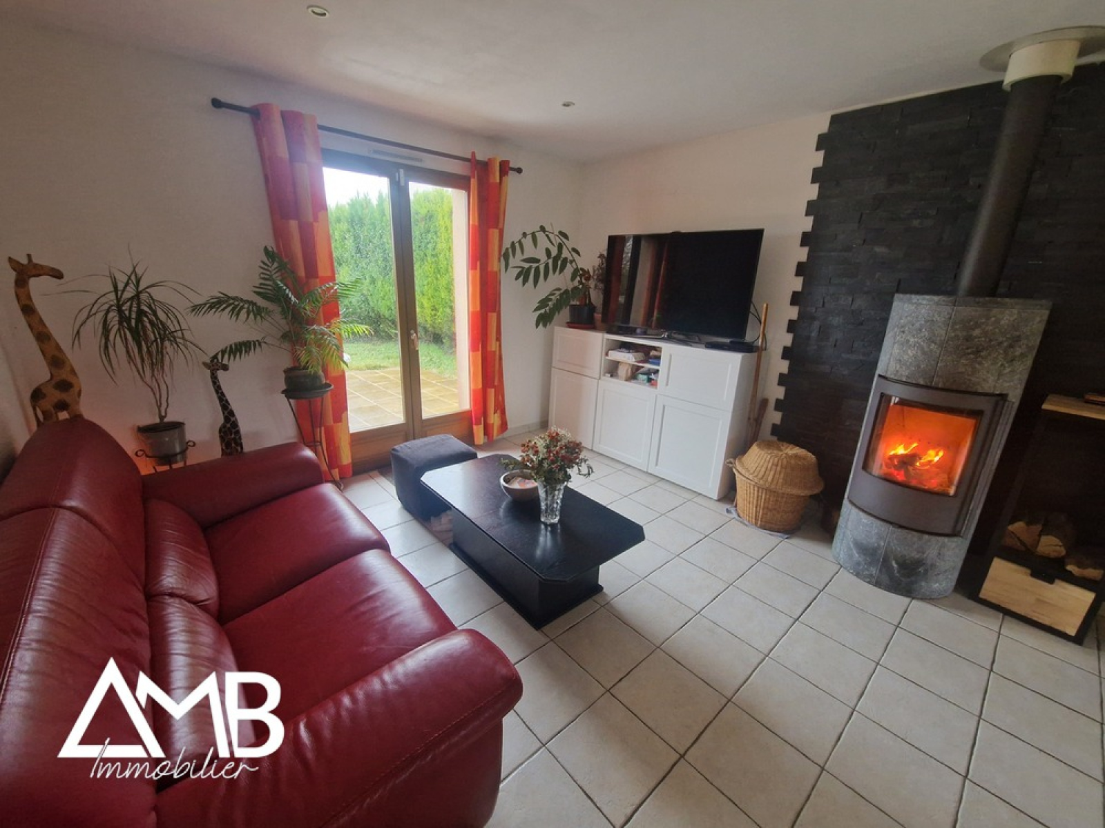 Elle se compose d'une entrée sur un séjour traversant avec son poêle à bois, cuisine séparée aménagée et équipée avec accès direct sur la terrasse, 3 chambres de plain pied, une salle de bains et un wc séparé.